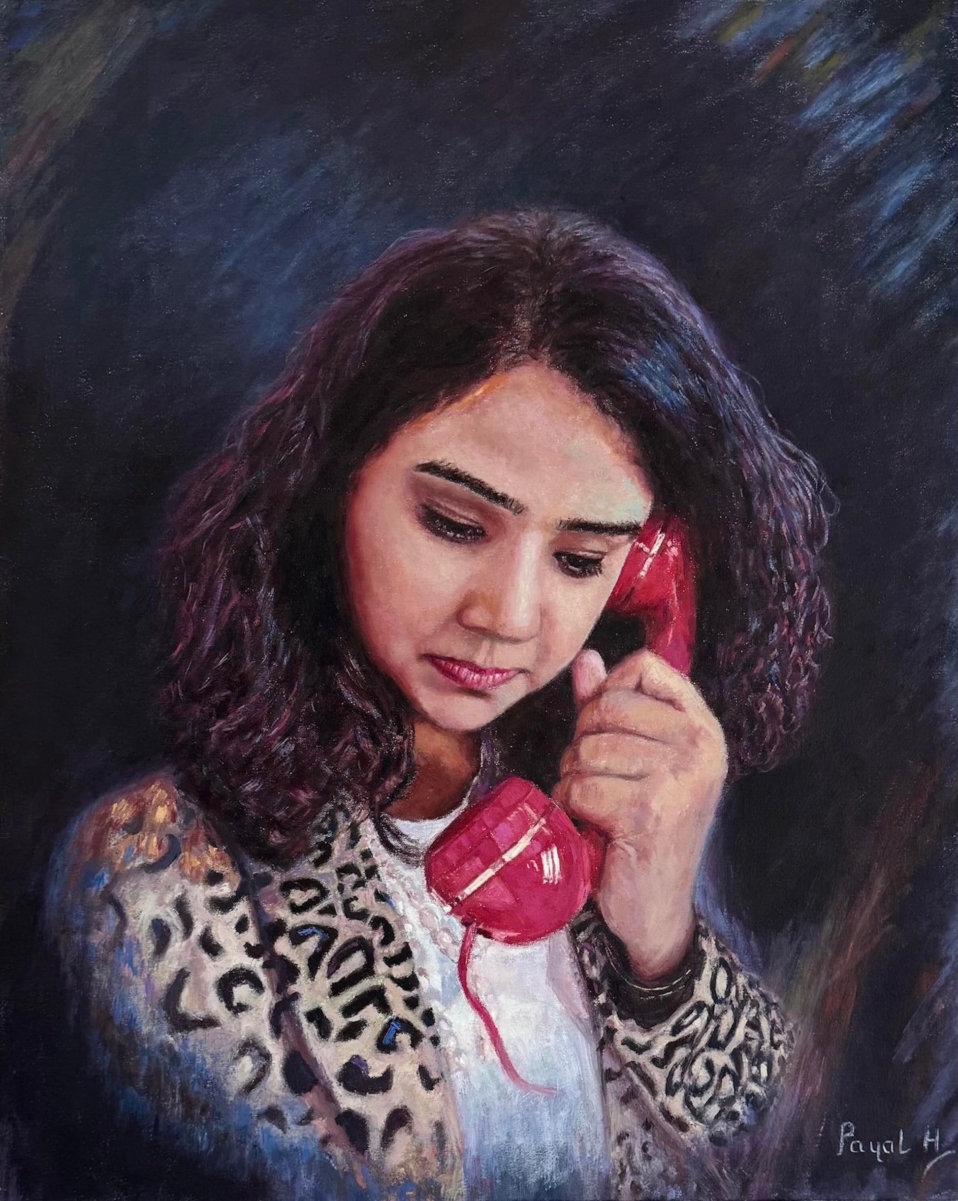 ‘Calling Home’ is a self-portrait through which I have attempted to depict joyous expectation whilst speaking to a loved one. Eyes cast down and pursed lips suggest an openness to listen. The retro phone evokes a sense of nostalgia reinforcing the theme of calling home.